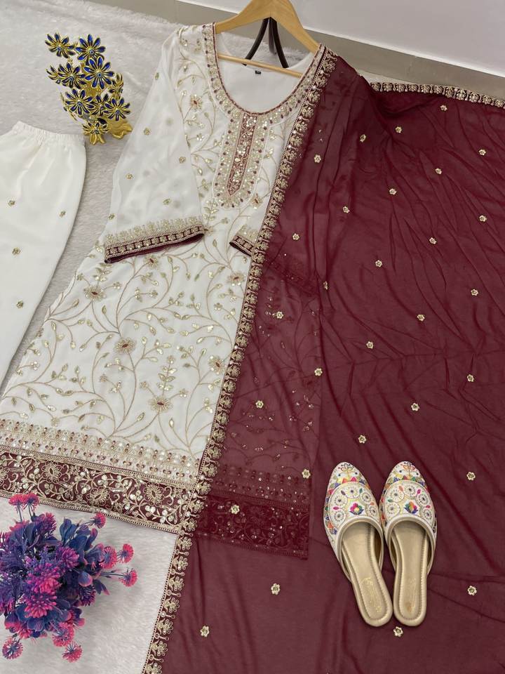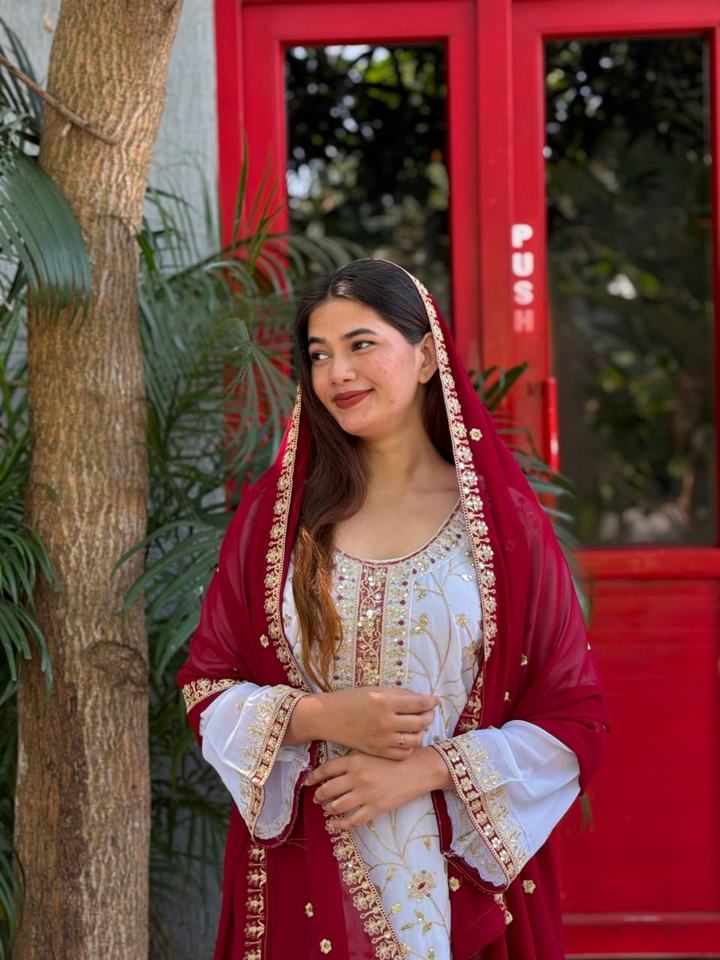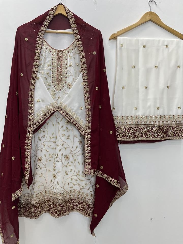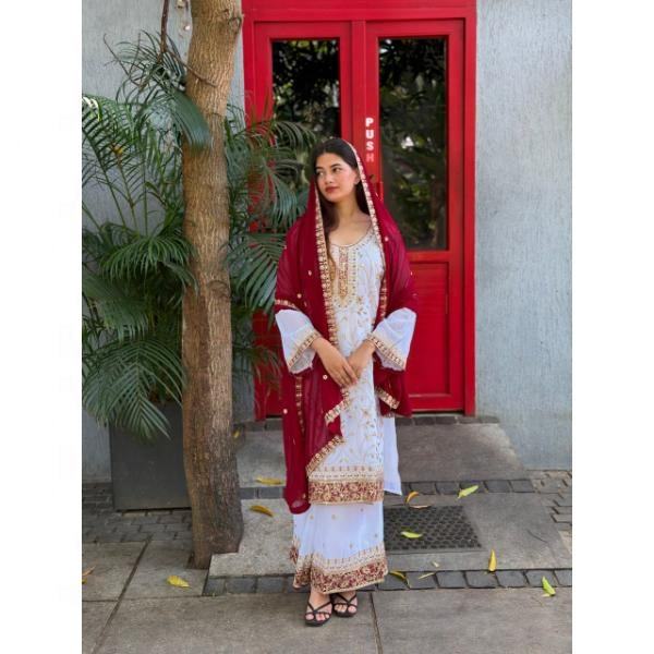 ชุดสาหรี่กะมีซปักลายฉลุหนักสไตล์โมเดิร์นสำหรับงานอีด ผ้าจอร์เจตต์ ประกอบด้วยเสื้อท่อนบน กางเกงพลัซโซ และผ้าคลุมไหล่ แฟชั่นจาก FATEMA