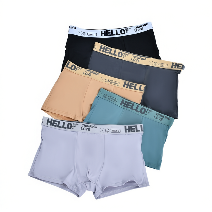 กางเกงบ็อกเซอร์ไร้ตะเข็บสำหรับผู้ชาย ELEGATE เอวกลาง ผ้าฝ้ายผสมสแปนเด็กซ์ ระบายอากาศ แห้งเร็ว แฟชั่นลาย Hello แพ็ค 10 ชิ้น