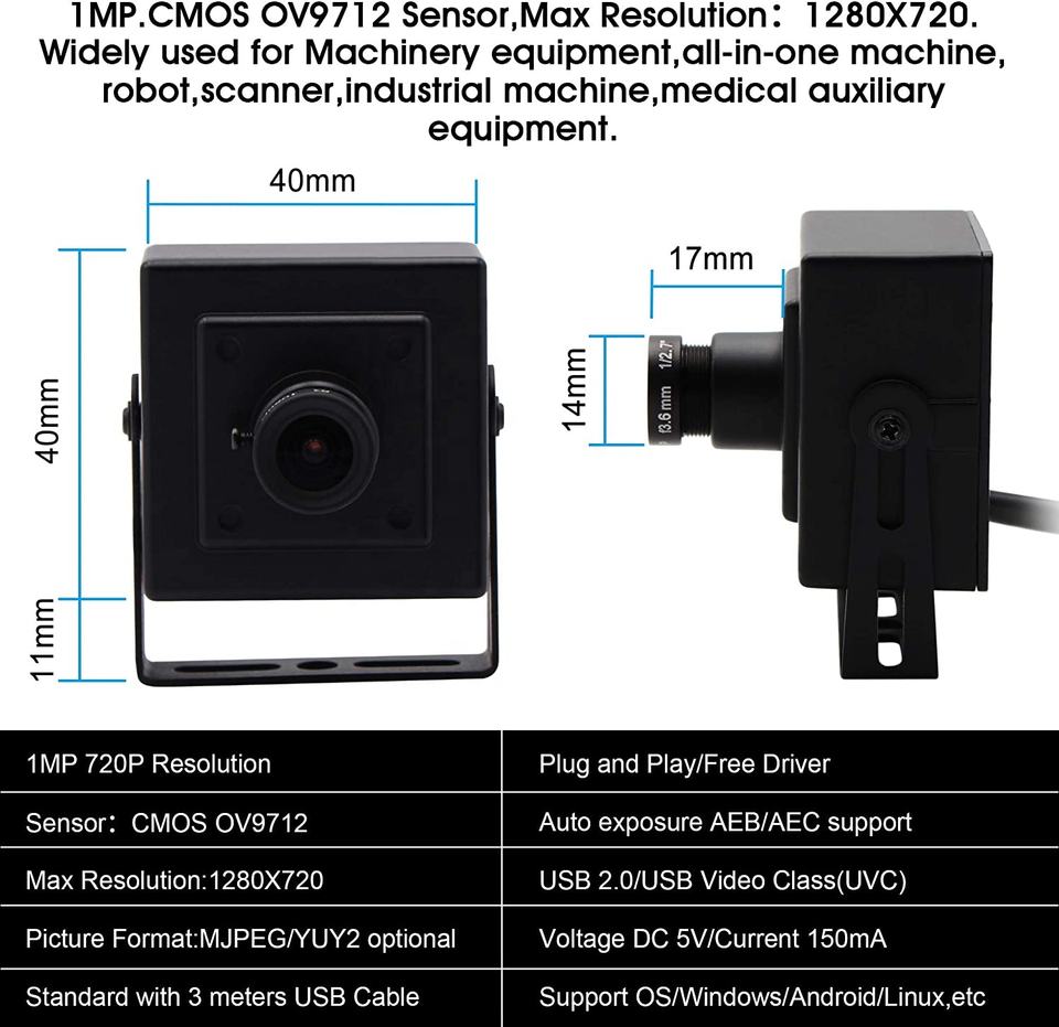 กล้อง ELP 1MP HD 720p USB กล้องเว็บแคมขนาดเล็กแบบพกพา เชื่อมต่อผ่านพอร์ต USB สำหรับ Android Linux Windows เครื่อง ATM, ตู้คีออสก์, หุ่นยนต์, เครื่องเล่นเกมเสมือนจริง
