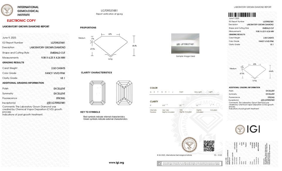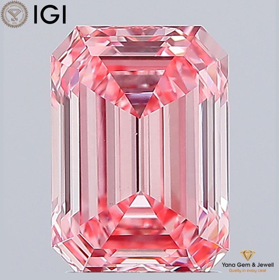 เพชรทรงมรกต ความสะอาดระดับ VS1 สีชมพูแฟนซีสดใส น้ำหนัก 2.50 กะรัต เพชร CVD ผลิตในห้องปฏิบัติการ พร้อมใบรับรอง IGI สำหรับแหวนแต่งงานแบบคลาสสิก