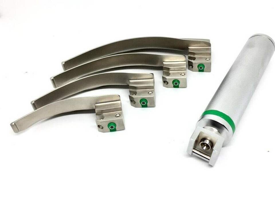 ชุดเครื่องมือผ่าตัดดมยาสลบและหู คอ จมูก EMT รุ่นด้ามจับขนาดกลาง Mac พร้อมใบมีด 5 ใบ กล้องไฟเบอร์ออปติกสำหรับตรวจกล่องเสียง