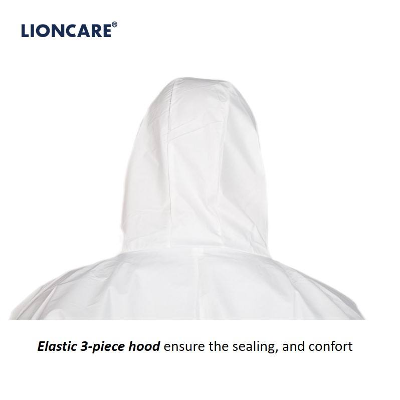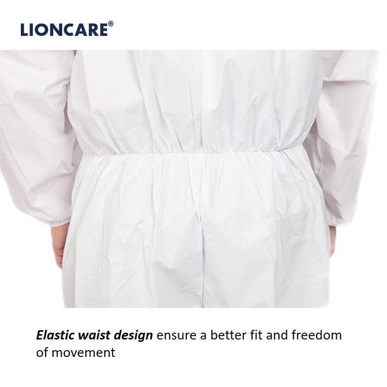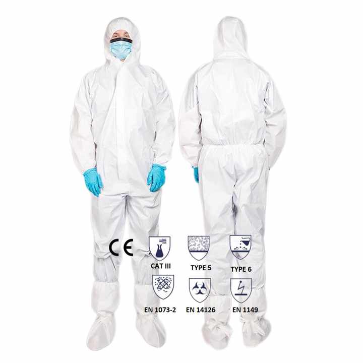 ชุดป้องกันสารเคมีแบบใช้แล้วทิ้งชนิด 5 6 ที่เป็นไปตามมาตรฐาน EN 14126 ผลิตจากโพลีโพรพิลีนแบบไมโครพอรัส ป้องกันการกระเด็นของสารเคมี ตามมาตรฐาน EN ISO 13982-1