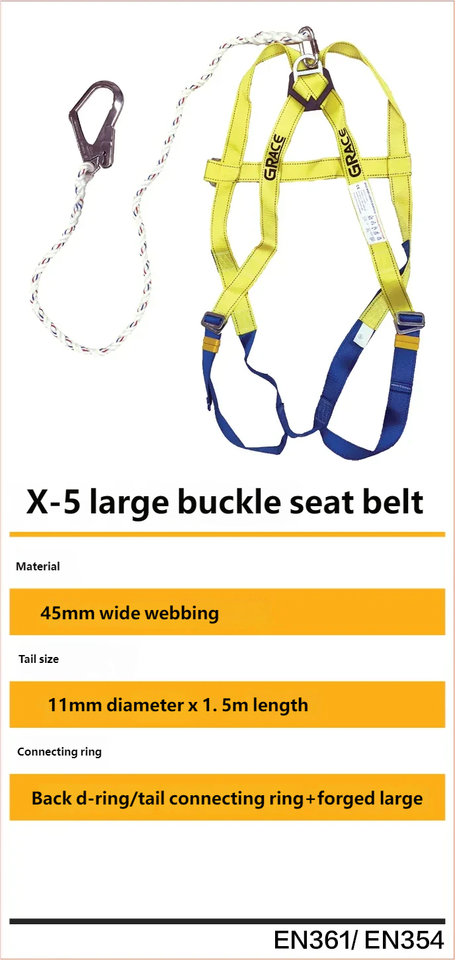 ชุดสายรัดนิรภัย EN361/EN354 X-5 ขนาด 45 มม. ทำจากโพลีเอสเตอร์ ความยาว 1.5 ม. ขนาดเส้นผ่านศูนย์กลาง 11 มม. พร้อมห่วงรูปตัว D ด้านหลัง + ตะขอขนาดกลางแบบฟอร์จ