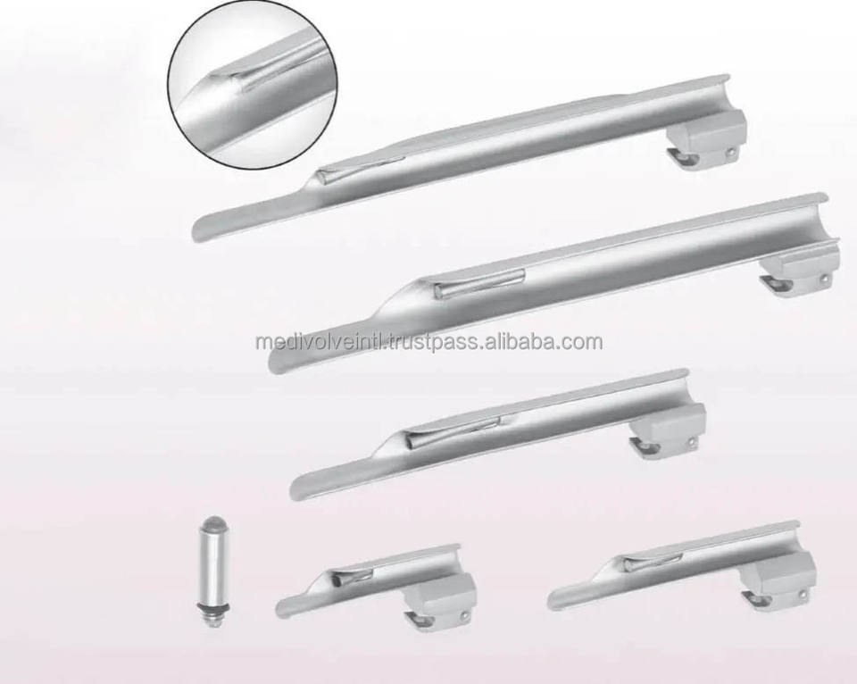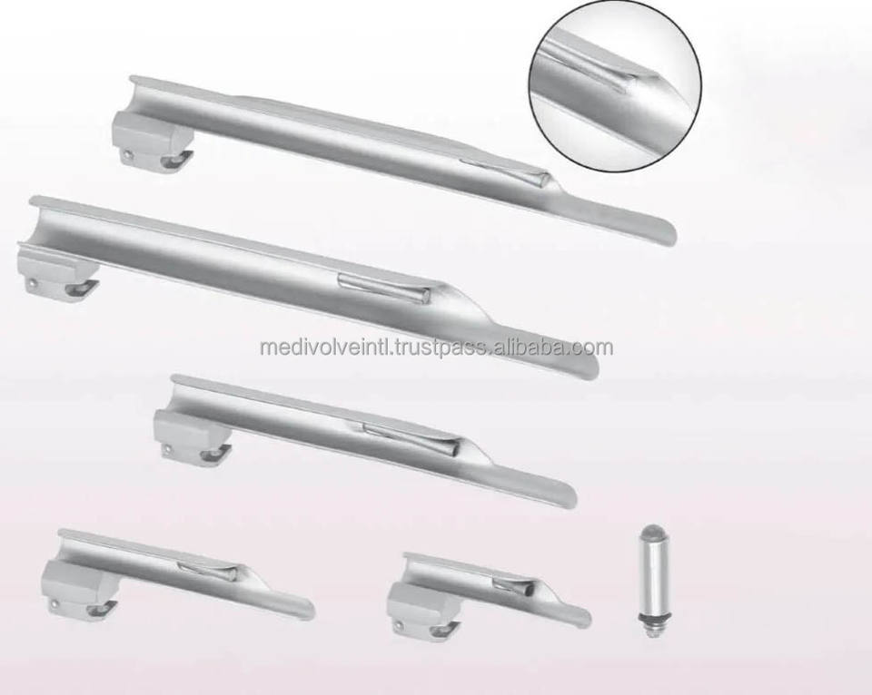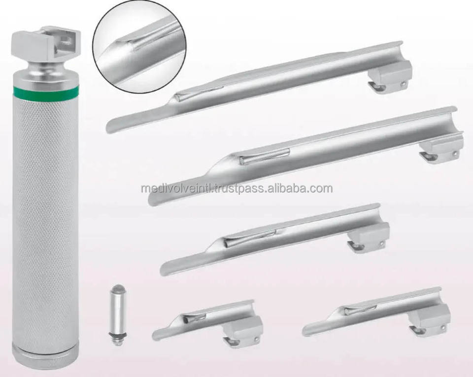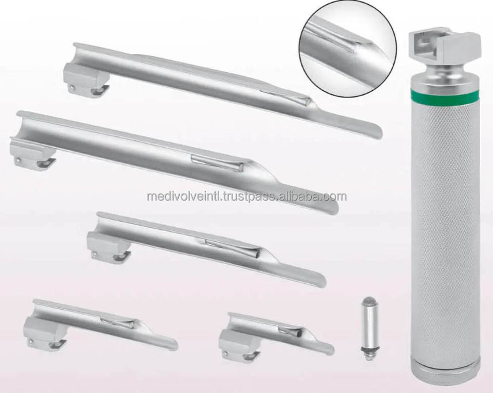 ชุดเครื่องมือส่องกล่องเสียงไฟเบอร์ออปติกแบบตรง 5 ชิ้น ยี่ห้อ Miller ผลิตจากสแตนเลสสตีล ใช้สำหรับการระงับความรู้สึกทางช่องหายใจ ได้รับการรับรองมาตรฐาน CE ISO จาก Medivolve