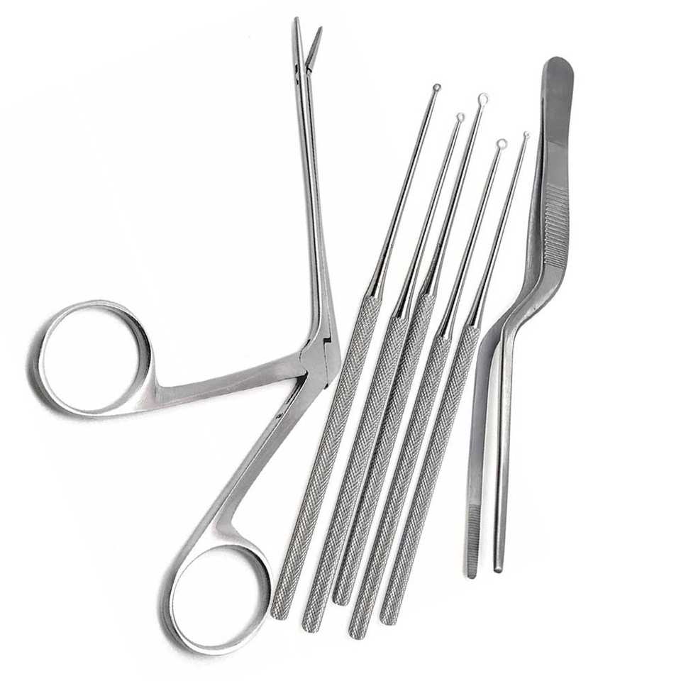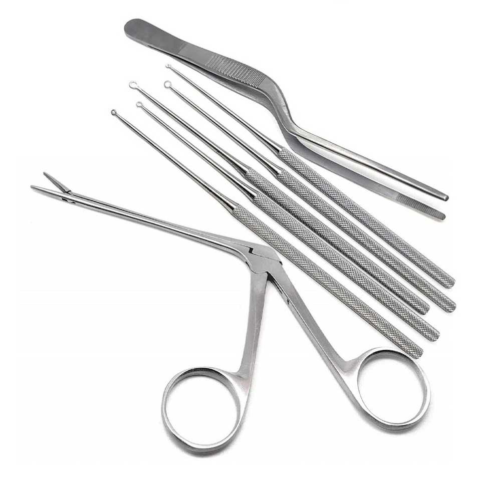 ชุดเครื่องมือผ่าตัดกำจัดขี้หูสำหรับหู คอ จมูก 7 ชิ้น ทำจากสแตนเลส ประกอบด้วย คีมปากจระเข้ คีมห่วงหู คีมปลายแหลม และเครื่องมือตรวจหู