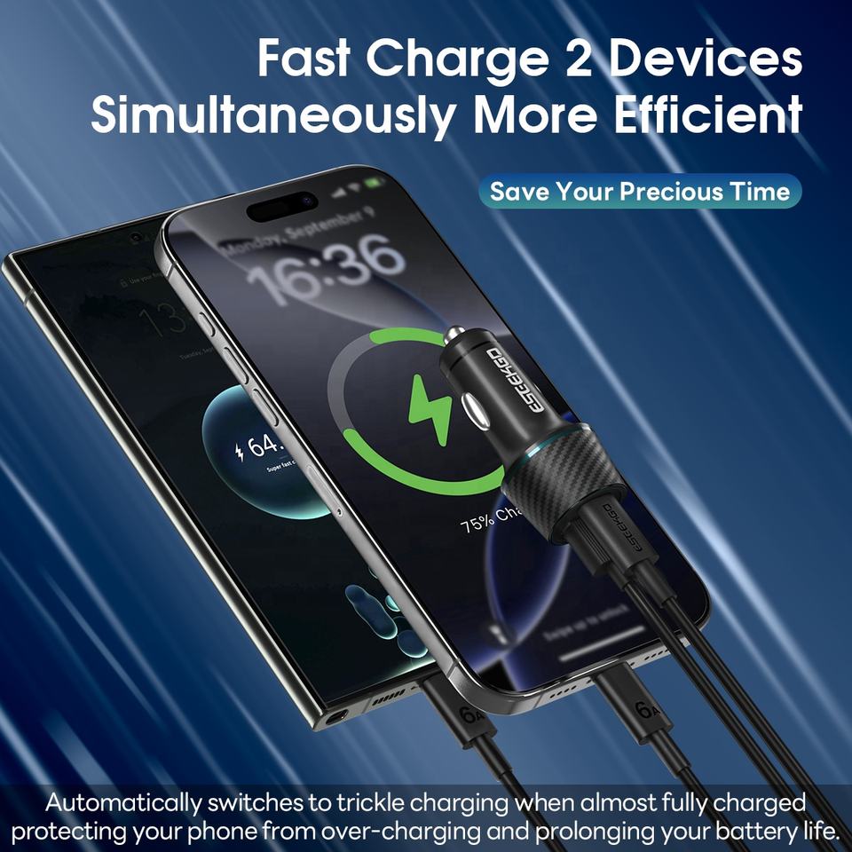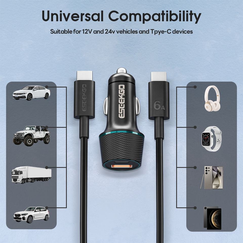 Eseekgo ที่ชาร์จในรถยนต์ CC-52C QC22.5W + PD30W 52.5W พร้อมสายชาร์จ3.3FT Type-C ถึง C เข้ากับรถใช้ได้ทั่วโลก