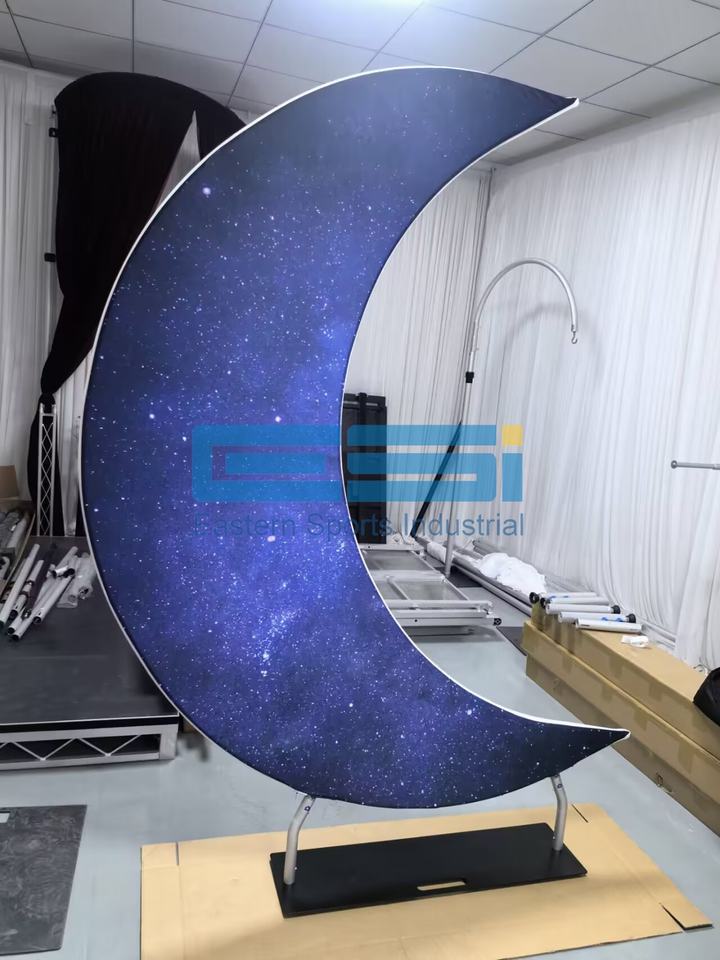 ชุดอุปกรณ์ฉากหลังงานแต่งงานแบบเรียบง่าย ESI ทำจากอลูมิเนียม พร้อมฉากหลังลายพระจันทร์ สำหรับเช่า