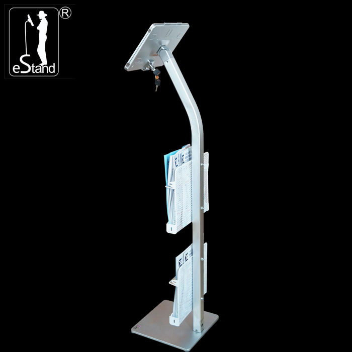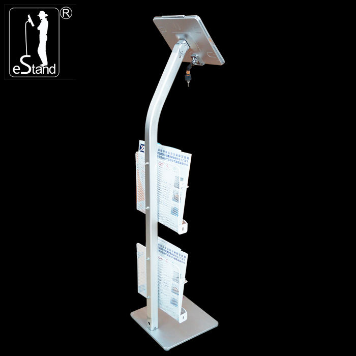 คำอธิบาย:ขาตั้งแท็บเล็ตโลหะสำหรับพื้น พร้อมตะกร้าใส่แม็กกาซีนและแผ่นพับ