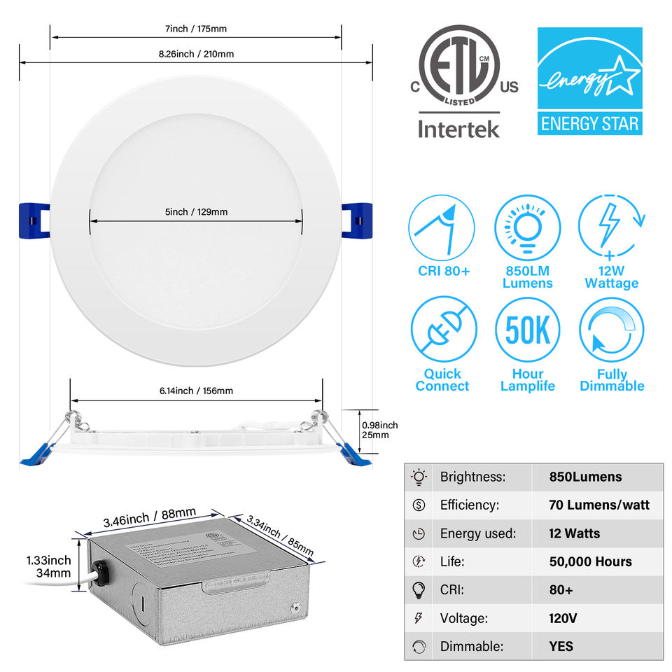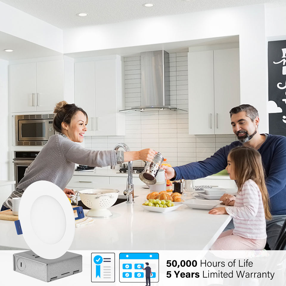 ไฟดาวน์ไลท์ LED แบบฝังขนาด 4 นิ้ว 6 นิ้ว ปรับความสว่างได้ พร้อมกล่องต่อสาย สำหรับสหรัฐอเมริกาและแคนาดา