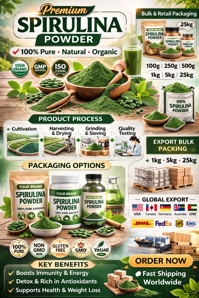 สารสกัดสาหร่ายสไปรูลิน่าออร์แกนิกมาตรฐาน EU USDA ความบริสุทธิ์ 99% ชนิดผงเกรดอาหาร บรรจุในภาชนะแก้ว/พลาสติก หรือบรรจุภัณฑ์แบบถัง
