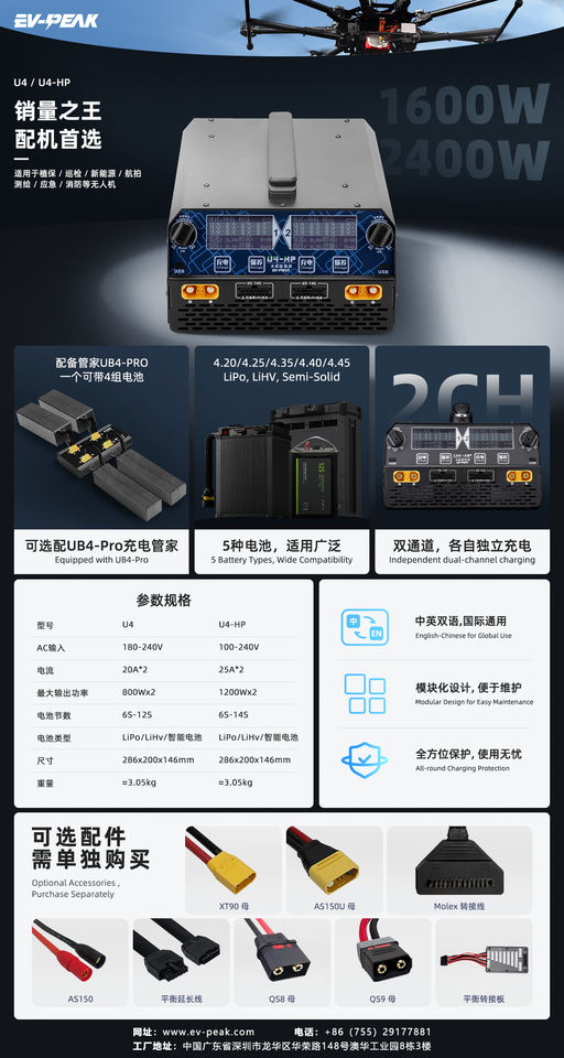 เครื่องชาร์จแบตเตอรี่อัจฉริยะ EV-PEAK U4-HP 6-14S 2400W LiPo/LiHV/เครื่องชาร์จอัจฉริยะสำหรับโดรนพ่นยาทางการเกษตร 1200W*2 25A
