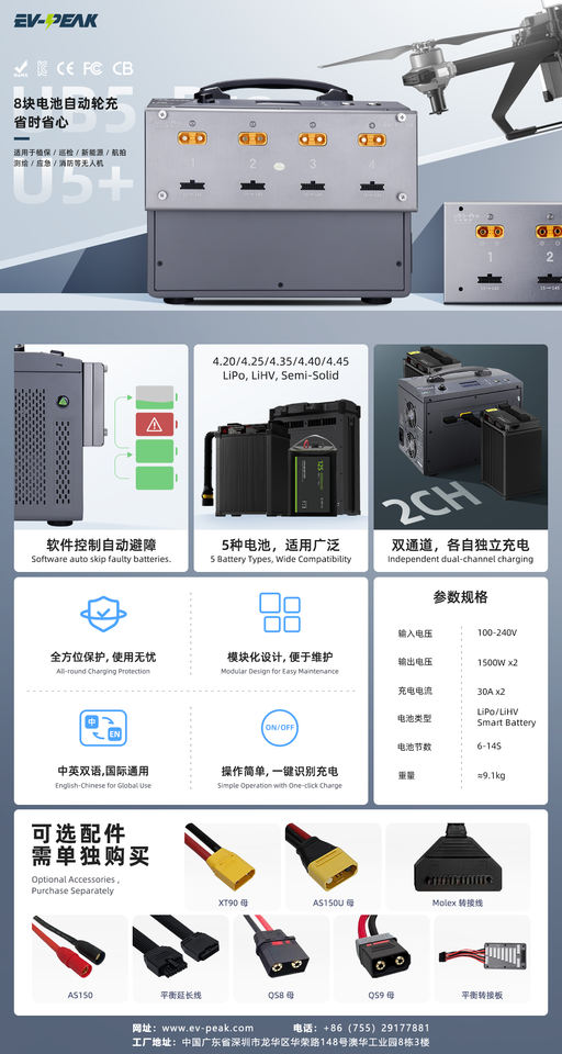 EV-PEAK U5+ เครื่องชาร์จแบบสองช่องสัญญาณ 3000W/30A อัจฉริยะ ชาร์จเร็ว โครงสร้างอลูมิเนียมอัลลอย สำหรับอุปกรณ์เสริมโดรนเกษตรกรรม