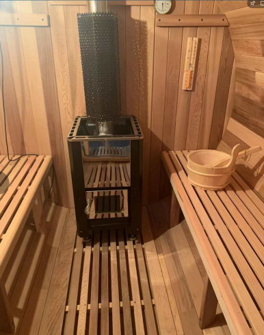 ห้องซาวน่ากลางแจ้งทรงสี่เหลี่ยมทำจากไม้เนื้อแข็ง ใช้ไฟฟ้า สำหรับ 6 คน พร้อมระบบไอน้ำ เป็นมิตรกับสิ่งแวดล้อม เหมาะสำหรับใช้ในโรงยิม/สปา ใช้เตาไม้