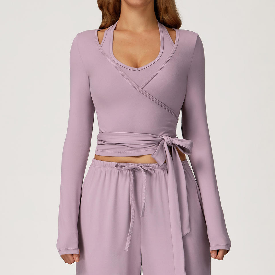 เสื้อโยคะแขนยาว EWT3058 แบบไขว้คอ ครอปท็อป สีลาเวนเดอร์ ชุดกีฬาสำหรับผู้หญิง