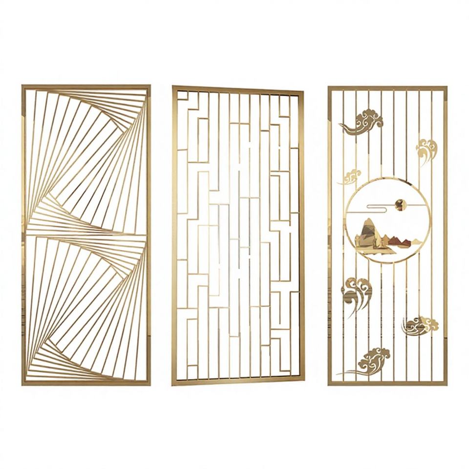 ฉากกั้นห้องสแตนเลสตกแต่งพื้นที่โรงแรม EX209 ฉากกั้นโลหะสำนักงานแบบกำหนดเอง ศิลปะโลหะทันสมัยสำหรับบ้าน ตัดด้วยเลเซอร์อเนกประสงค์ ทนทาน