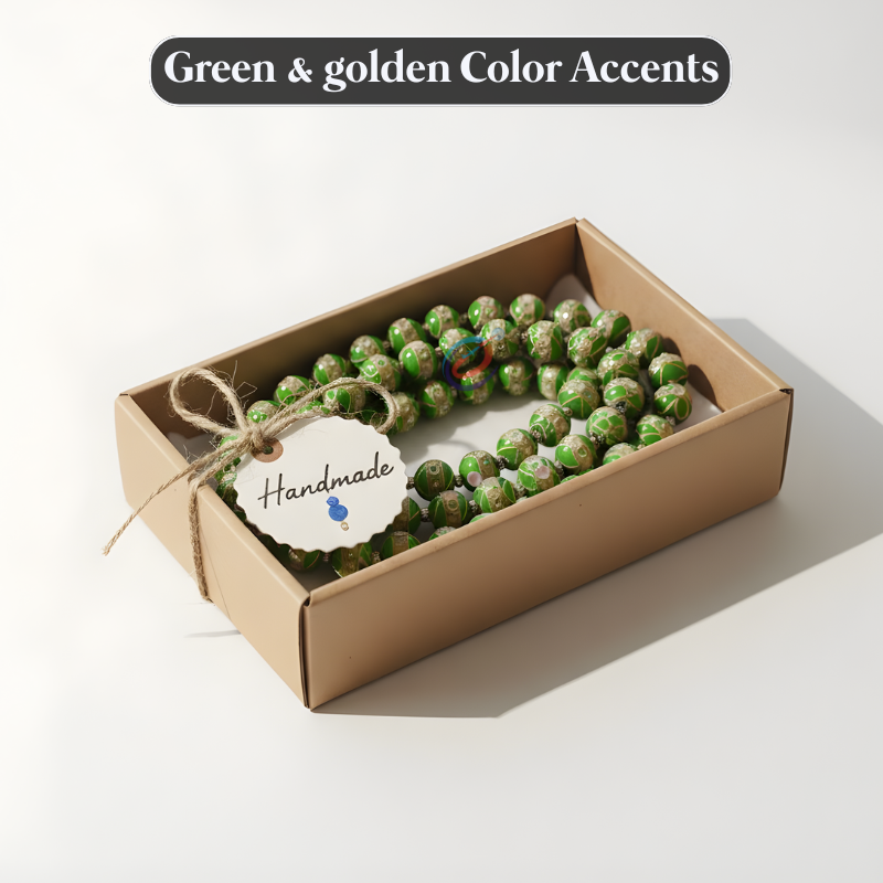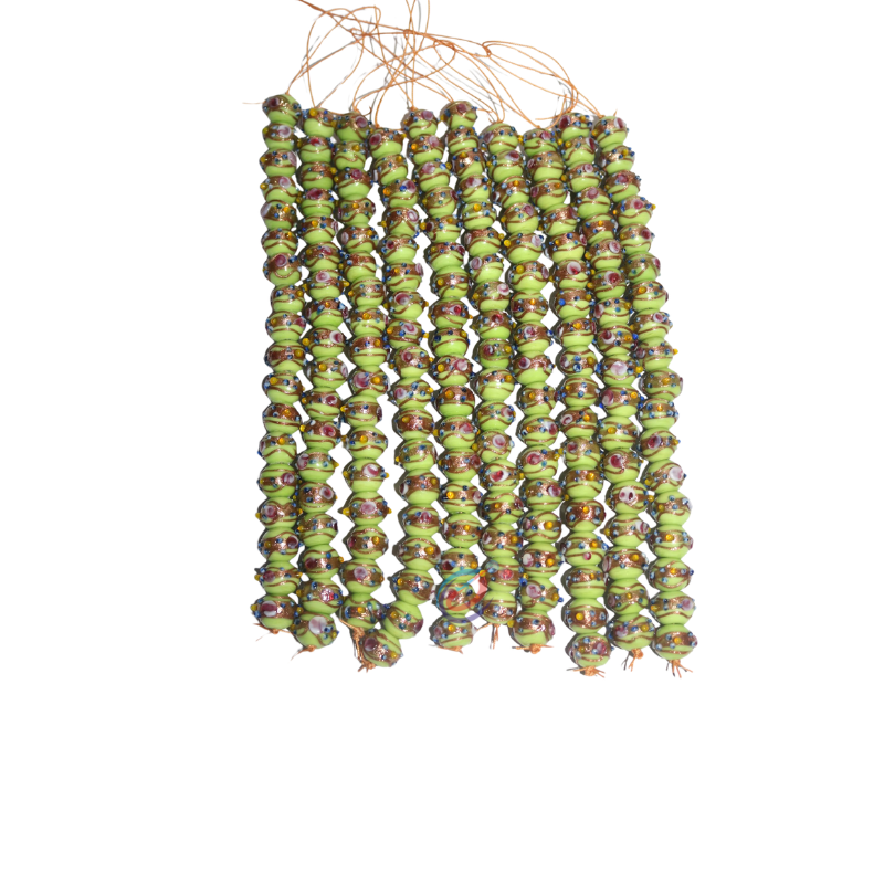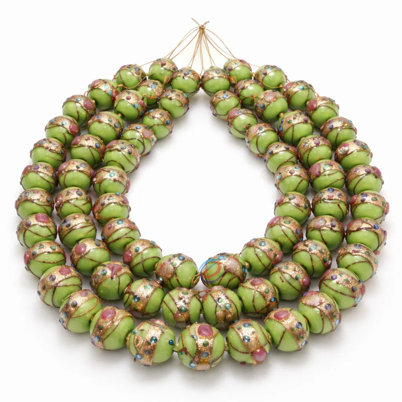 ลูกปัดแก้วดีไซน์เนอร์สีเขียวมะนาวขนาด 16 มม. จาก EXCEL EXPORTS | ลูกปัดแก้วมูราโน่ทำมือ ลายวนสีทอง ขนาด 8 นิ้ว สำหรับงาน DIY