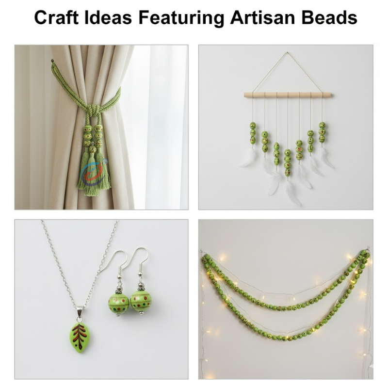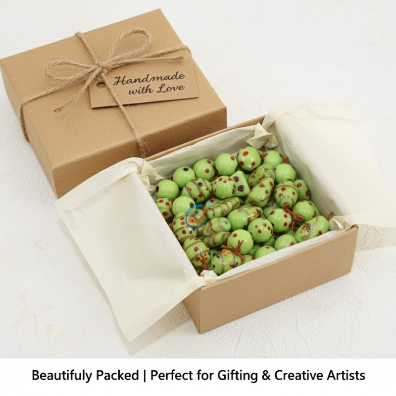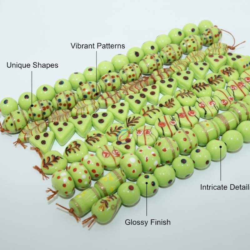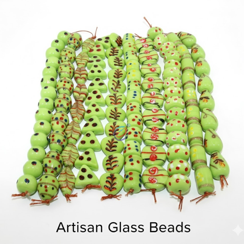ลูกปัดแก้วทำมือสีเขียวอ่อนจาก EXCEL EXPORTS | เส้นใยขนาด 8 นิ้ว | รูปแบบและลวดลายที่มีเอกลักษณ์เฉพาะตัว | ทำงานฝีมือ DIY