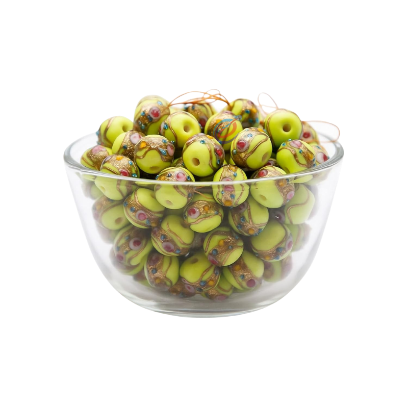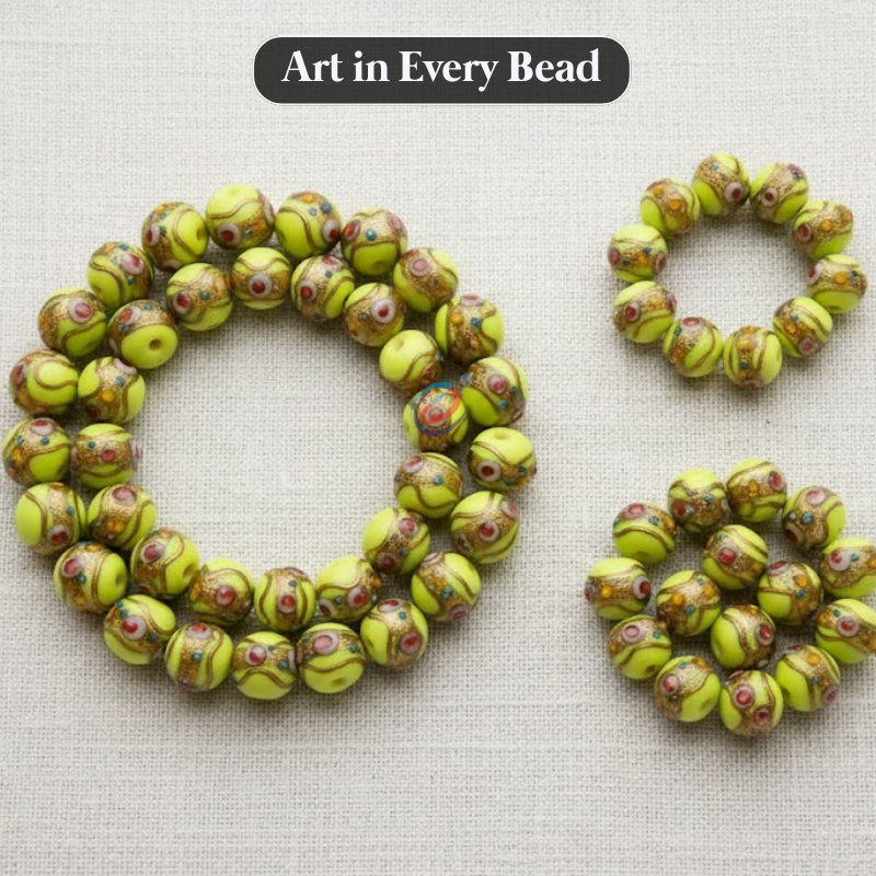 ลูกปัดแก้วทำมือสีเขียวมะนาวจาก EXCEL EXPORTS | ดีไซน์เค้กแต่งงานทรงกลมขนาด 12 มม. | การทำเครื่องประดับแบบเส้นยาวขนาด 8 นิ้ว