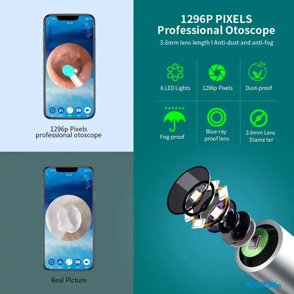 กล้องดูขี้หูพร้อมอุปกรณ์กำจัดขี้หูแบบไร้สาย ชุดอุปกรณ์กำจัดขี้หูพร้อมกล้องตรวจหูมุมกว้างความละเอียดสูง 1296P พร้อมไฟส่องสว่าง