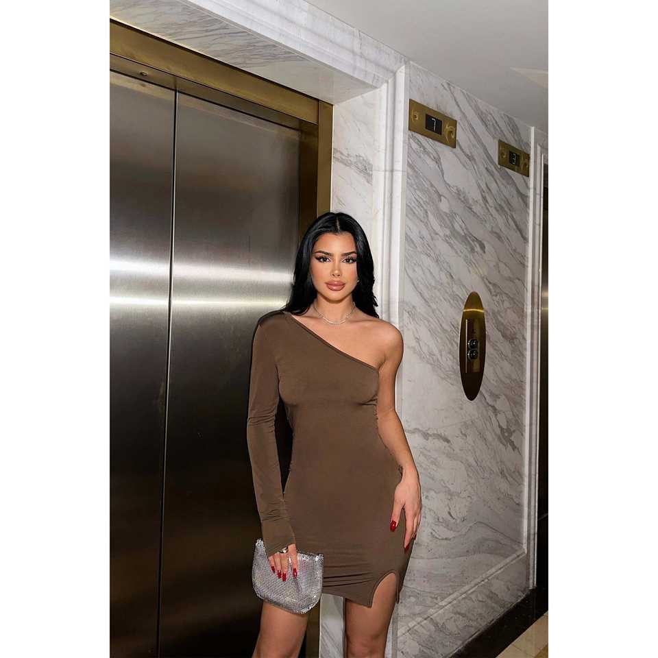 เดรสสั้นแขนเดียวทรงเอ็มไพร์ คอเหลี่ยม ลายเรียบ คุณภาพสูง ไซส์ XL สำหรับฤดูร้อน ใส่ไปเที่ยวชายหาดหรือคลับได้