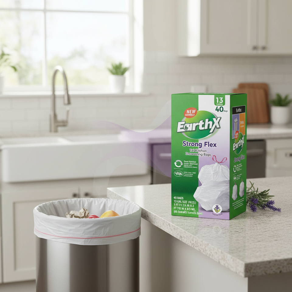 ถุงขยะ EarthX Strong Flex 13 แกลลอน แบบมีเชือกรูด ป้องกันกลิ่น สำหรับใช้ในครัว 40 ใบ