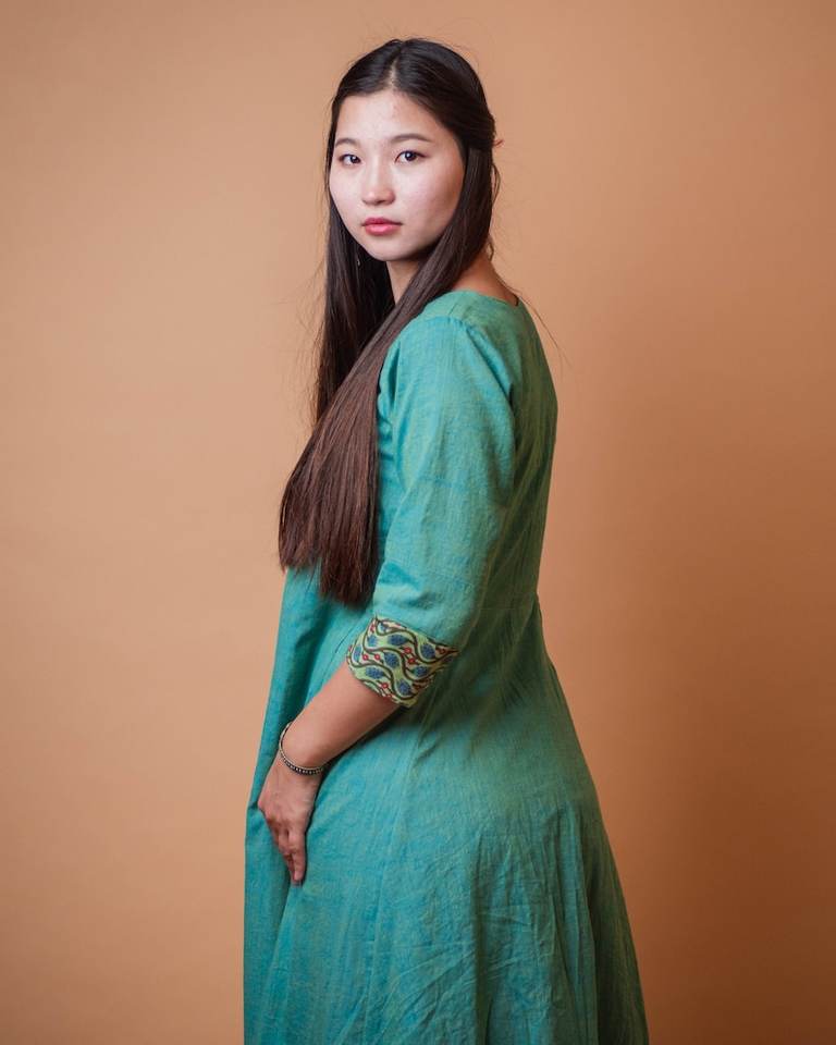 ชุดเดรสผ้าฝ้ายทอมือสไตล์โบฮีเมียน สีฟ้าเขียว แฟชั่นที่เป็นมิตรต่อสิ่งแวดล้อม