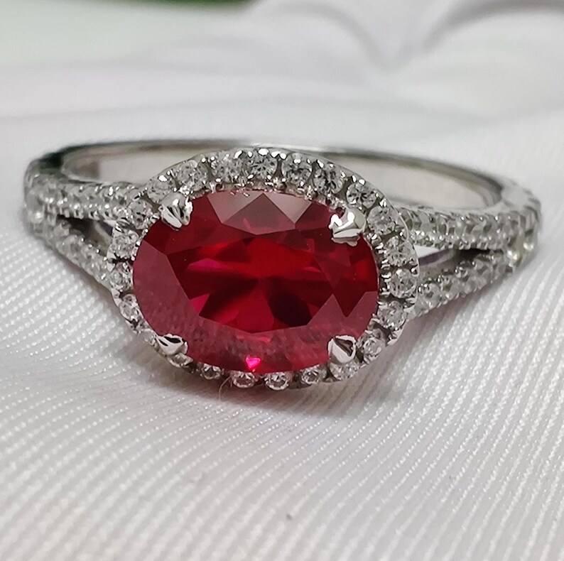 แหวนมอสซาไนต์รูปไข่สีแดงทับทิมแบบวงแหวนสองวงประดับเพชรทรงรัศมีสำหรับผู้หญิง เงินแท้ 925 ของแท้ ของขวัญสำหรับขอแต่งงานสำหรับเธอ