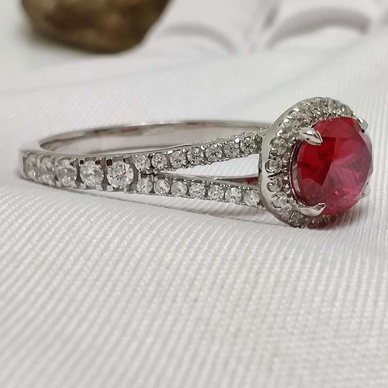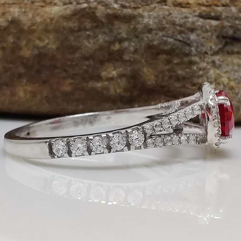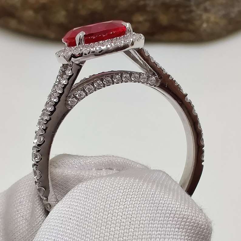 แหวนโอวัลคัททับทิมสีแดง แบบสองทาง ประดับเฮโล