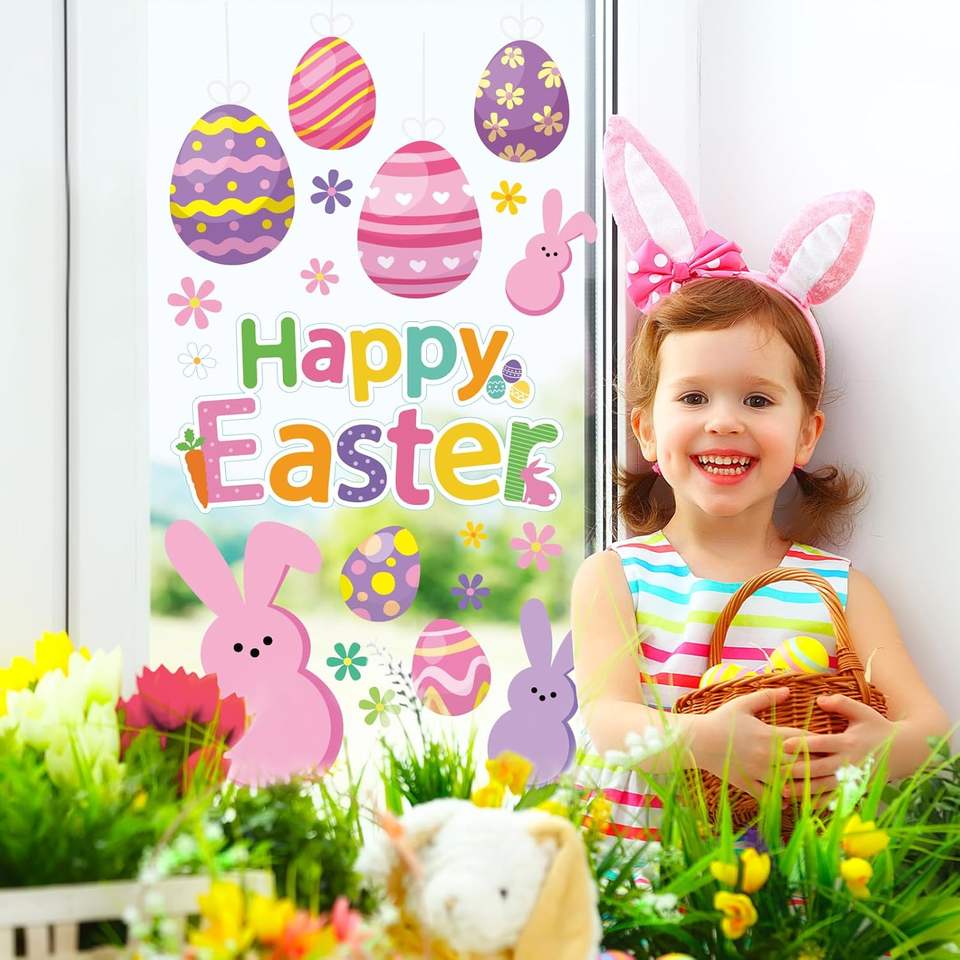 สติกเกอร์หน้าต่างไข่อีสเตอร์กระต่ายอีสเตอร์สติกเกอร์กระจกสองด้านสำหรับตกแต่งงานปาร์ตี้107ชิ้น9แผ่น