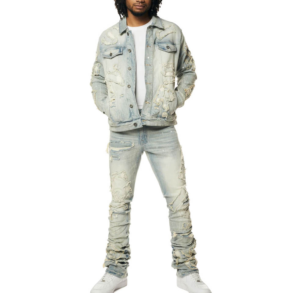 ชุดแจ็คเก็ตและกางเกงยีนส์เดนิมผู้ชายสไตล์ฮิปฮอปสำหรับฤดูหนาว น้ำหนักเบา สวมใส่ง่าย ดีไซน์เรียบง่าย ปรับแต่งได้ ผลิตจากผ้าฝ้าย 100% ระบายอากาศได้ดี มีทุกขนาด