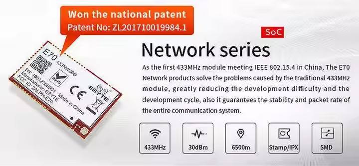 โมดูลเครือข่ายไร้สาย Ebyte ODM E70-433NW30S รองรับเครือข่ายไร้สายหลายระบบ กำลังส่ง 30dBm ระยะ 6.5 กม. ความถี่ 433mhz ช่องสัญญาณ UART สำหรับการเชื่อมต่อแบบ Star Networking