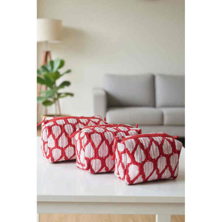 ชุดกระเป๋าเครื่องสำอางแบบซิป 3 ชิ้น ลายใบไม้สีแดงรูปทรงเรขาคณิต เป็นมิตรกับสิ่งแวดล้อม กระเป๋าอเนกประสงค์ขนาดใหญ่ลายบล็อกสีทำมือ