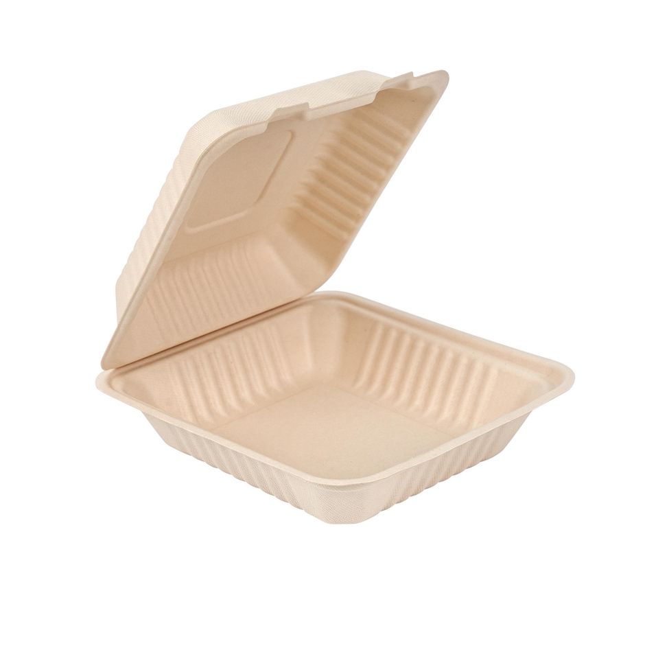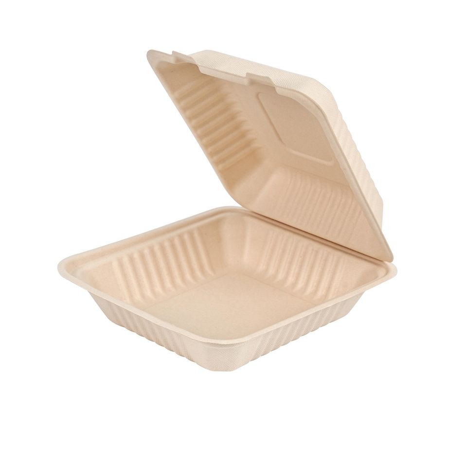 กล่องอาหารแบบฝาพับ 9x9 นิ้ว ทำจากชานอ้อย เป็นมิตรต่อสิ่งแวดล้อม ย่อยสลายได้ เหมาะสำหรับร้านอาหารและอาหารแบบซื้อกลับบ้าน