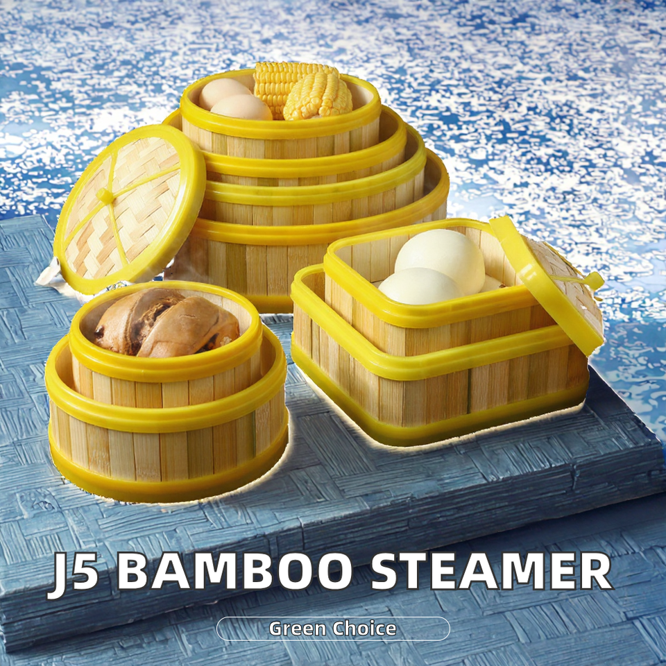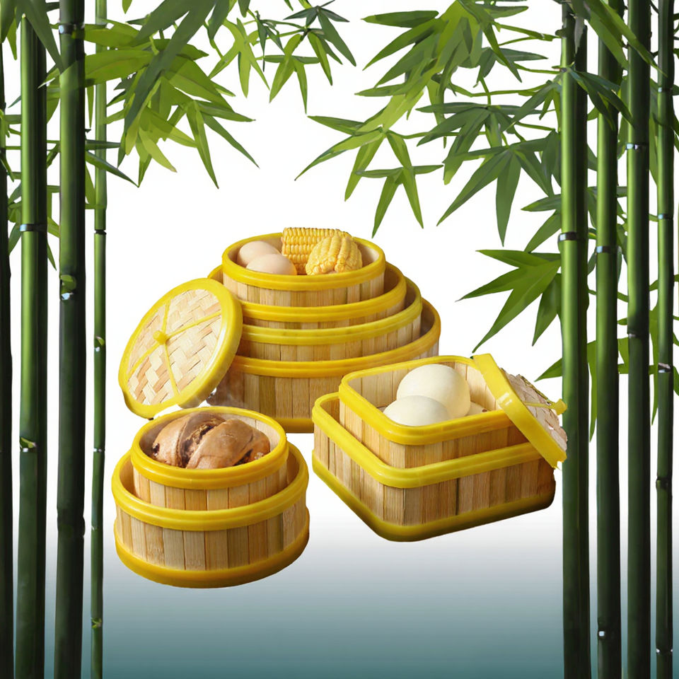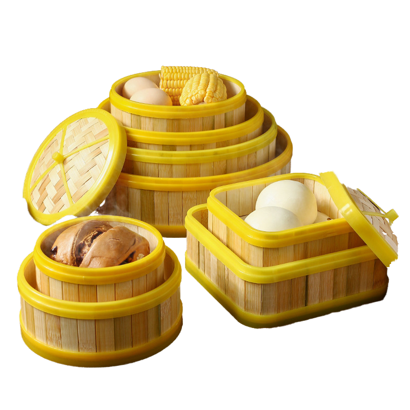 หม้อนึ่งไม้ไผ่ที่เป็นมิตรกับสิ่งแวดล้อมพร้อมขอบพลาสติกสำหรับใช้ในเชิงพาณิชย์พร้อมขนมปังนึ่งและติ่มซำที่ Nhatminh