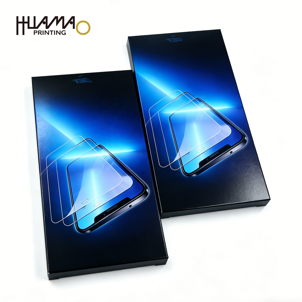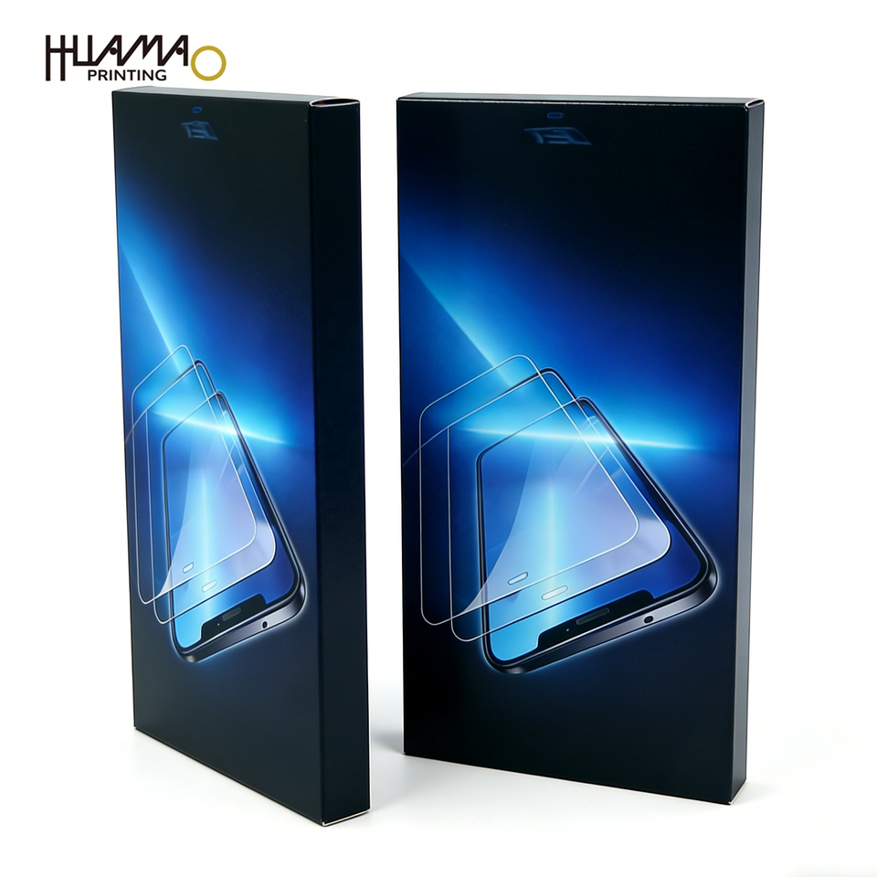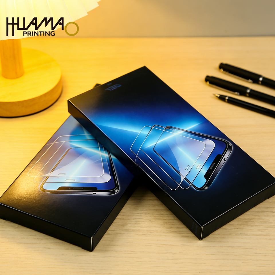 กล่องกระดาษแข็งสีดำรักษ์โลกสำหรับบรรจุภัณฑ์ฟิล์มกันรอยกระจกนิรภัยแบบมีโลโก้และขนาดตามสั่ง ขายส่ง