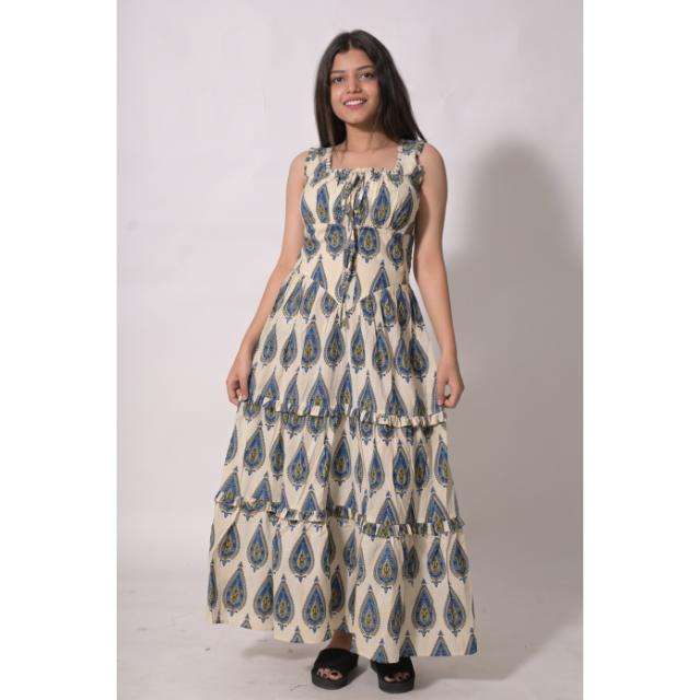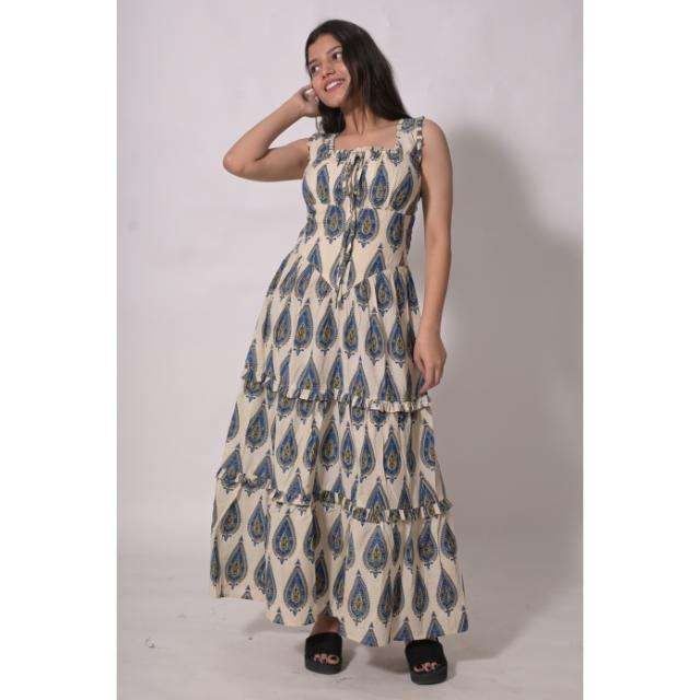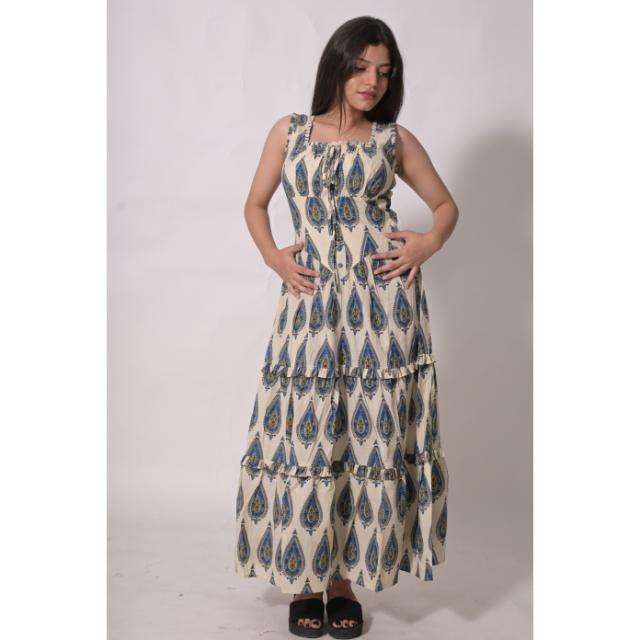 Eco-Friendly Block Print Bohemian Sleeveless Maxi Dress with Elastic Waist Breathable Cotton Summer Wear