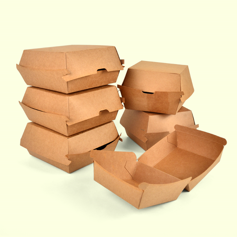 กล่องแฮมเบอร์เกอร์กระดาษคราฟท์สี่เหลี่ยมเป็นมิตรกับสิ่งแวดล้อมกล่องใส่อาหารกลับบ้านเคลือบ UV ปรับแต่งยี่ห้อได้