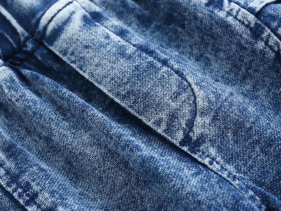 เสื้อผ้าเด็กผู้ชายแบบเป็นมิตรกับสิ่งแวดล้อม ชุดเดนิมสีพื้นแบบซักแล้ว สำหรับฤดูใบไม้ร่วง ชุด 2 ชิ้น