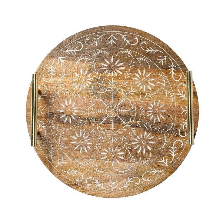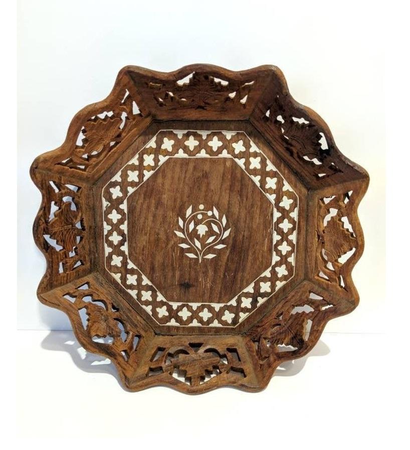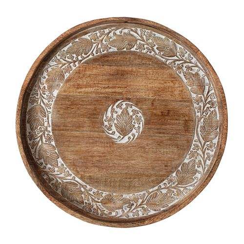 ถาดไม้ทรงกลมเป็นมิตรกับสิ่งแวดล้อมถาดไม้สไตล์ออตโตมันแกะสลักลายดอกไม้สำหรับตกแต่งโต๊ะกาแฟในห้องครัว