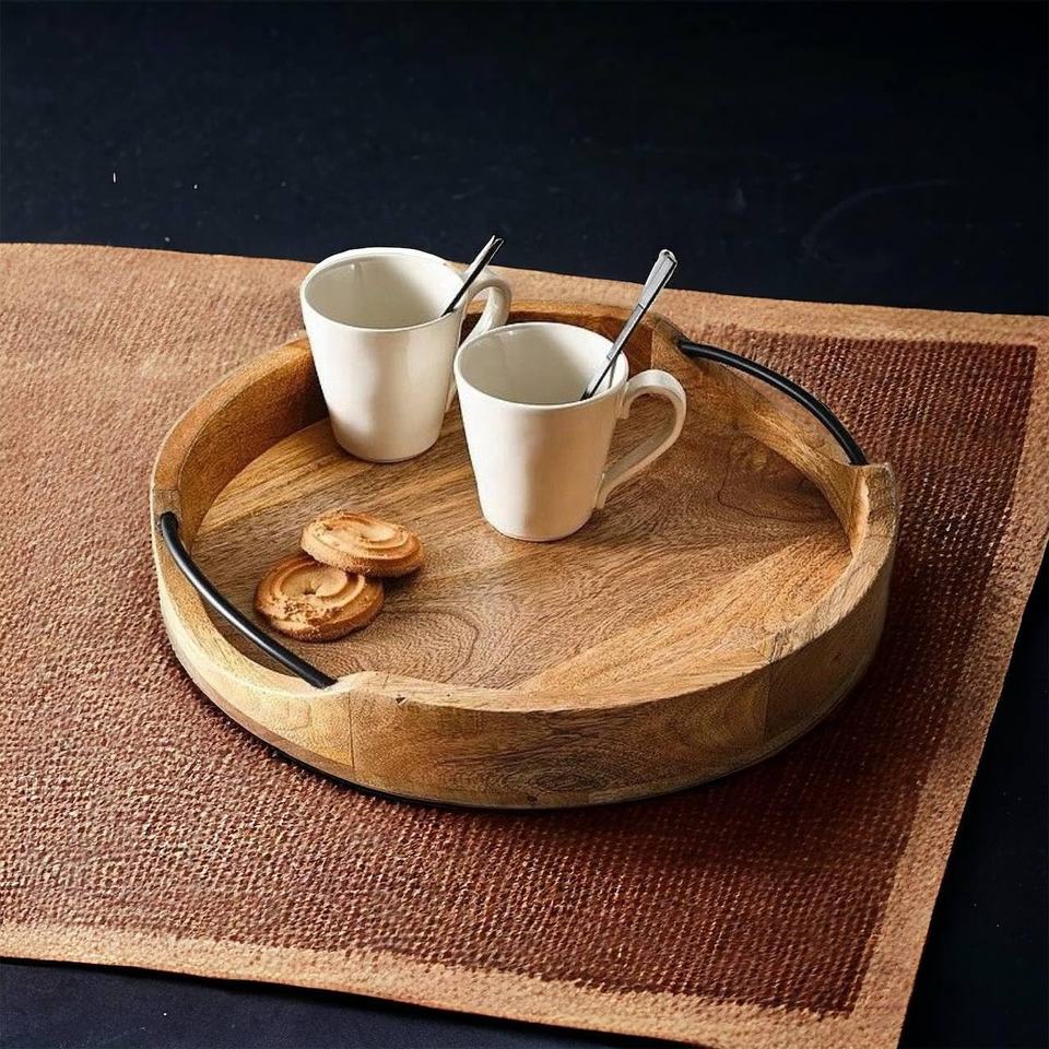 ถาดเสิร์ฟไม้กลมแบบคลาสสิกเป็นมิตรกับสิ่งแวดล้อมพร้อมด้ามจับทองเหลืองหรูหราสวยงามผลิตภัณฑ์ตกแต่งบ้านโรงแรมร้านอาหาร