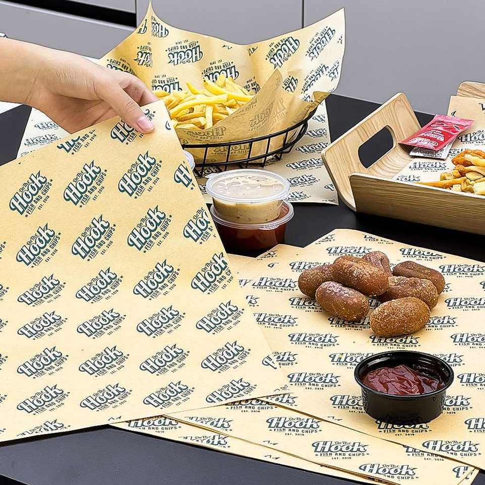 กระดาษห่อแฮมเบอร์เกอร์แบบกำหนดเองที่เป็นมิตรกับสิ่งแวดล้อม กระดาษห่อแบบใช้แล้วทิ้งกันน้ำมัน สำหรับเฟรนช์ฟรายส์ ร้านอาหารฟาสต์ฟู้ดแบบนำกลับบ้าน