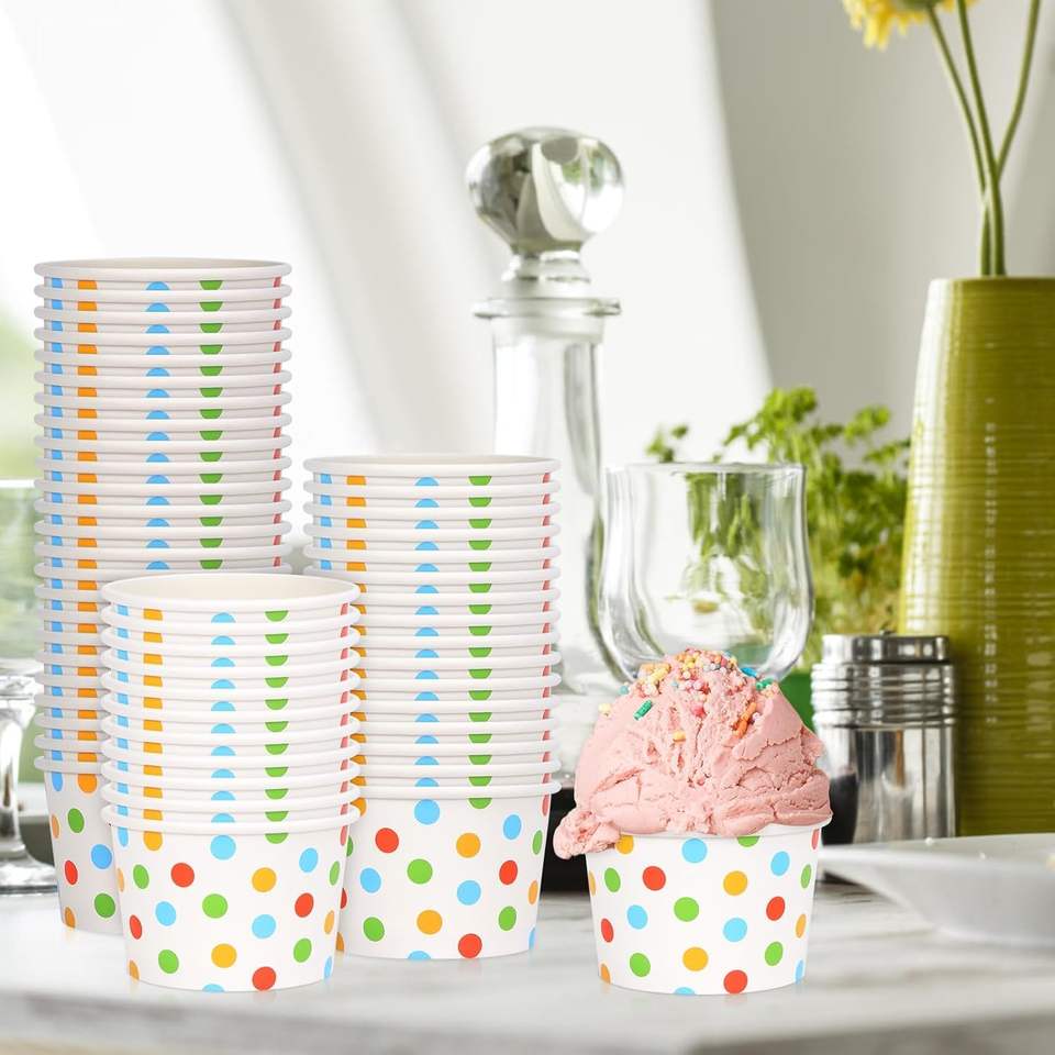 ถ้วยกระดาษไอศกรีมสำหรับเด็กถ้วยกระดาษไอศกรีมขนาดเล็กพิมพ์ลายสีขาวเป็นมิตรกับสิ่งแวดล้อมพร้อมฝาพลาสติก