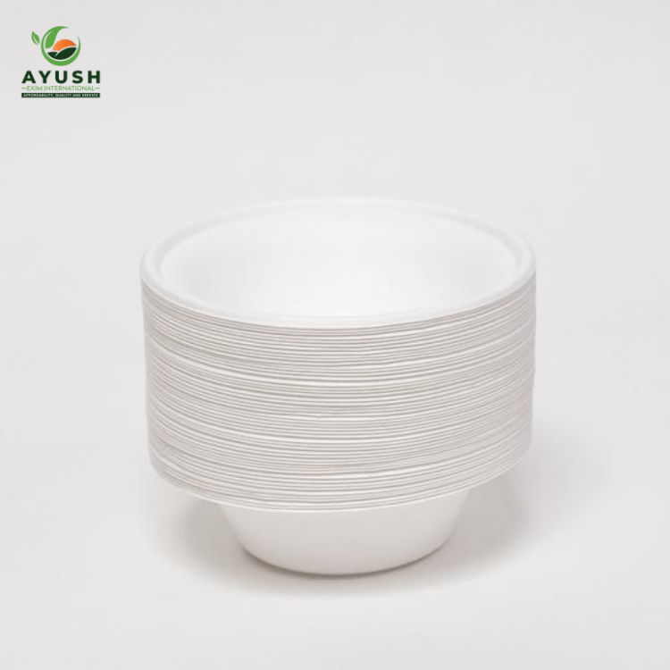 จานและชามอาหารทรงกลมจากชานอ้อย เป็นมิตรกับสิ่งแวดล้อม ใช้แทนโฟมยูรีเทน เหมาะสำหรับร้านอาหารที่เร่งรีบและงานปาร์ตี้
