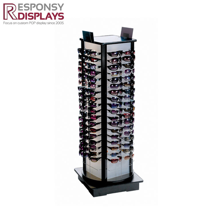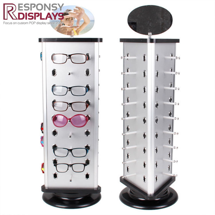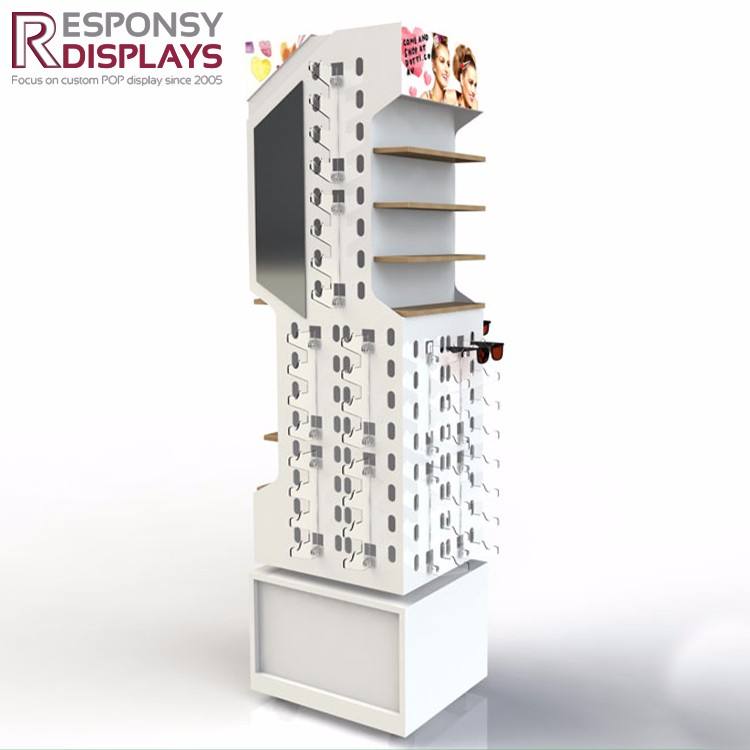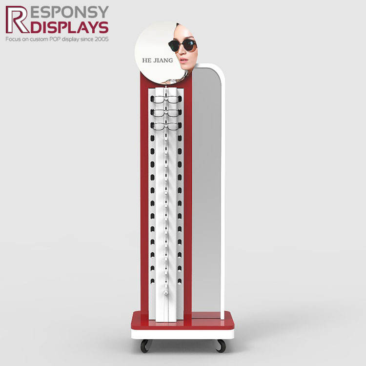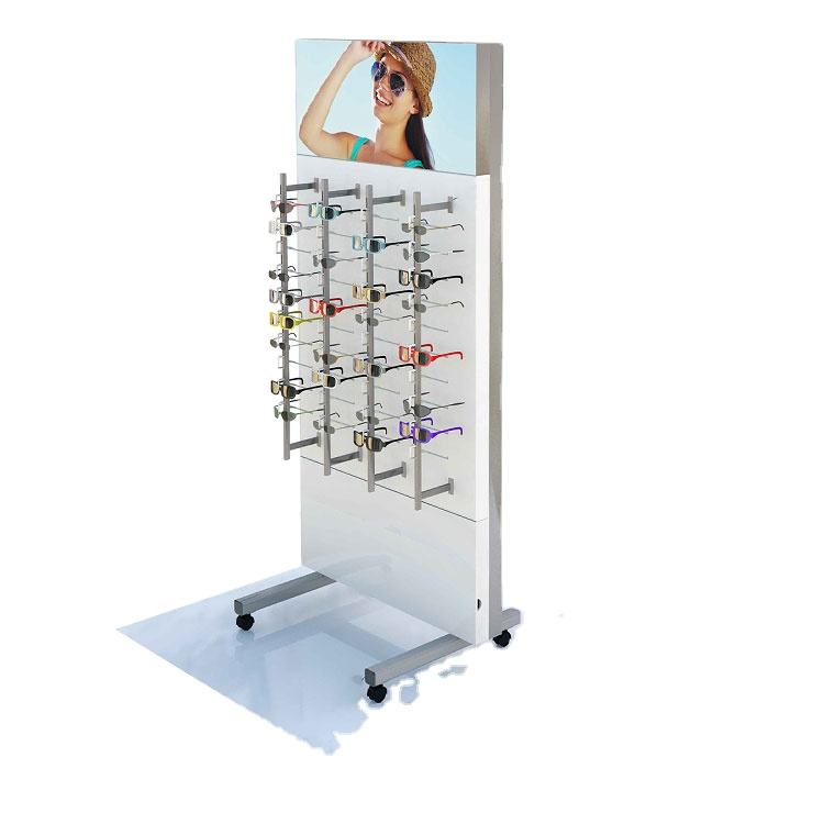 ราวแขวนตั้งพื้นทำจากไม้และเหล็กล็อกสำหรับจัดแสดงแว่นกันแดดเป็นมิตรกับสิ่งแวดล้อม