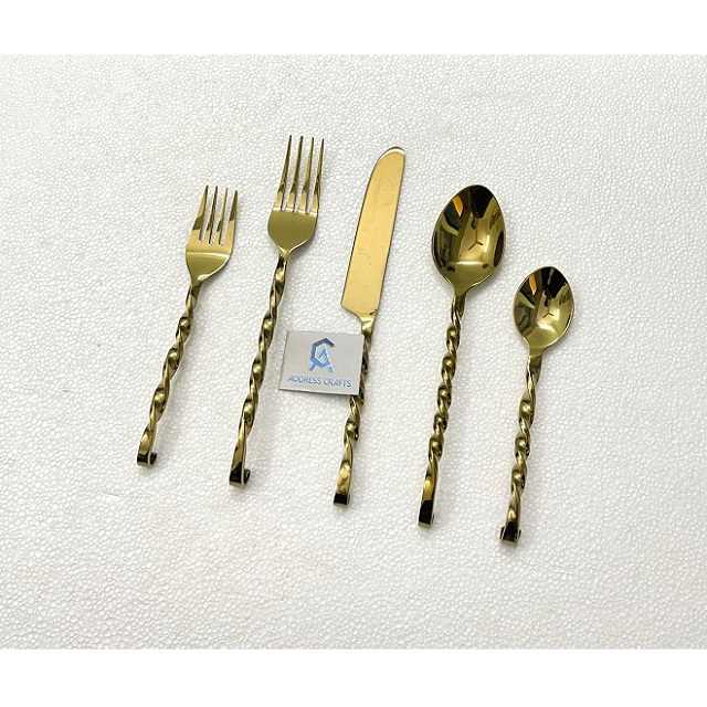 ชุดช้อนส้อมมีดเคลือบทองแบบเป็นมิตรกับสิ่งแวดล้อม พร้อมด้ามจับแบบเกลียว สำหรับจัดโต๊ะอาหารในงานแต่งงาน