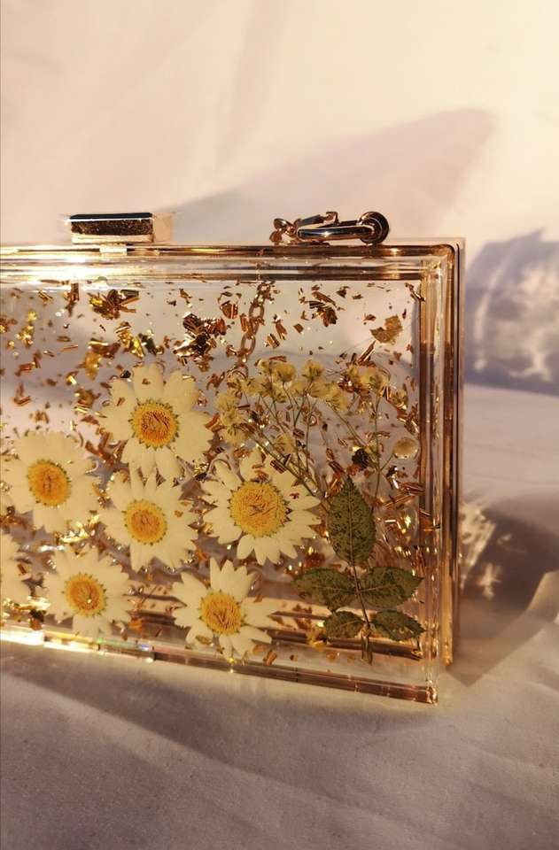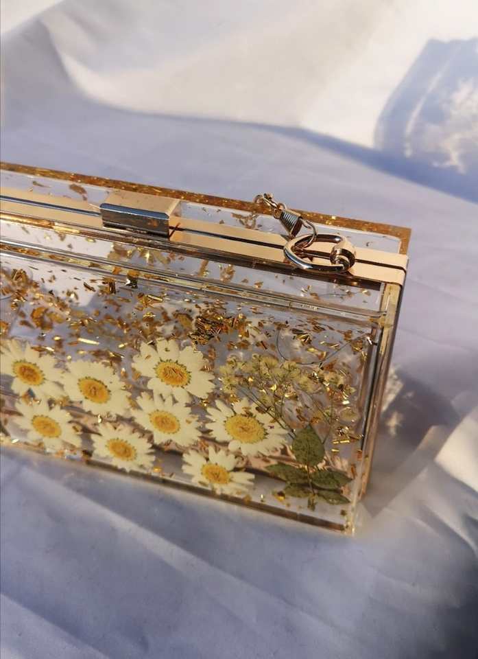 กระเป๋าคลัทช์เรซิ่นลายดอกเดซี่สีทองแบบกดอัด วาดลายด้วยมือ เป็นมิตรกับสิ่งแวดล้อม สำหรับตกแต่งงานแต่งงานและเป็นของขวัญ