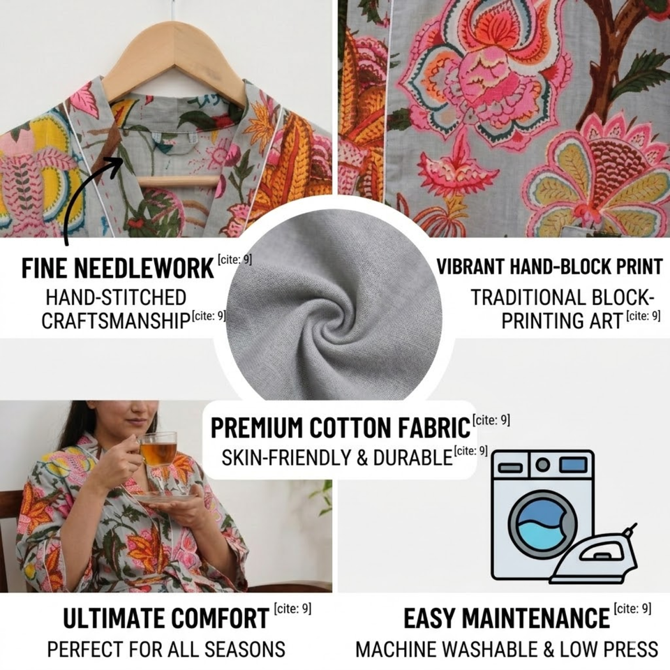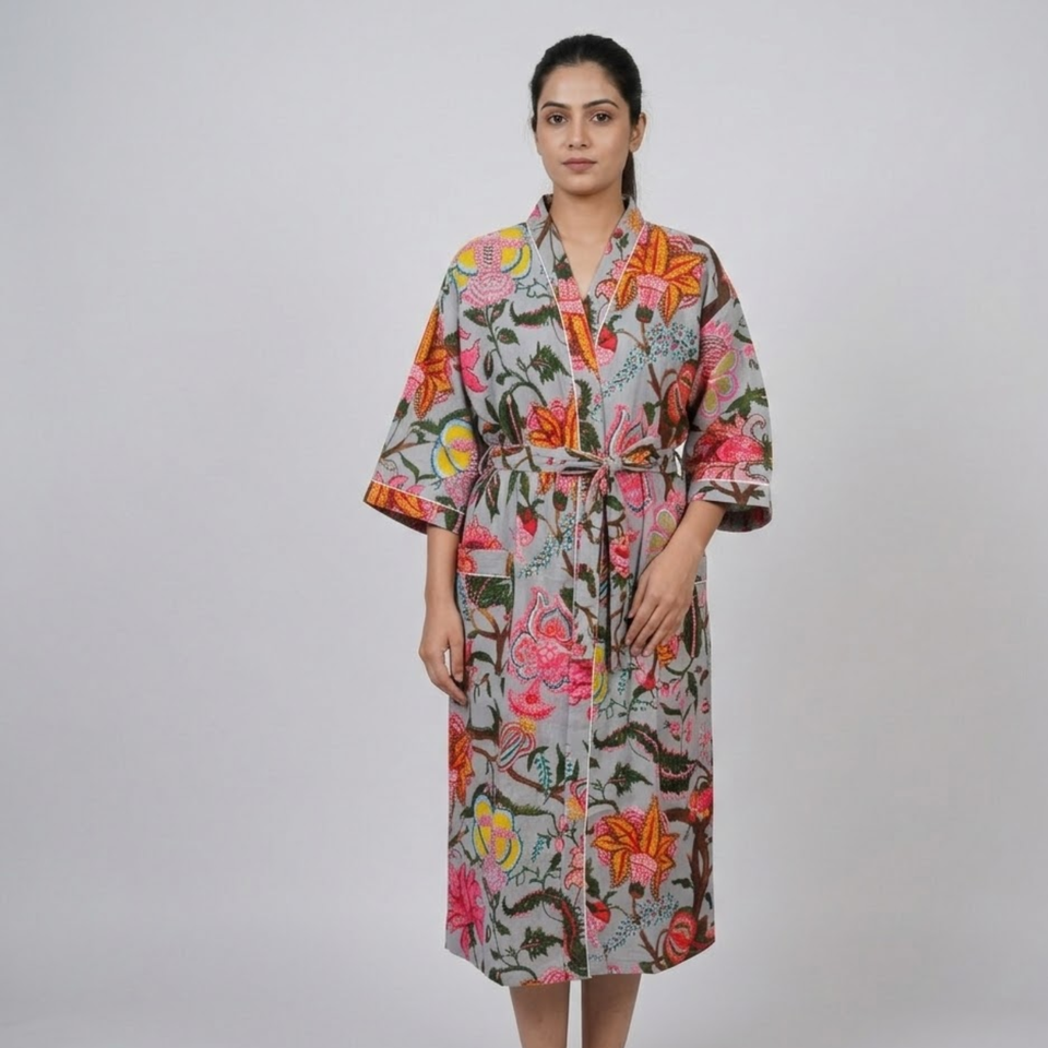 Eco Friendly Grey Floral Cotton Kimono Robe Long V Neck Nightwear With Drawstring Women Long Sleeve Loungewear Maria Garments