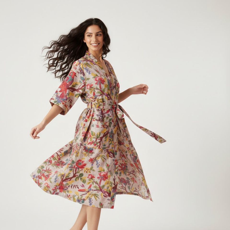Eco Friendly Handloom Cotton Kimono V Neck Long Sleeve Jungle Bird Print Nightwear Women Sustainable Long Length Luxury Robe