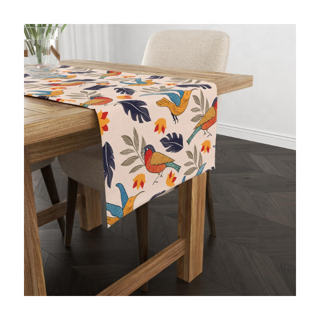 ผ้าปูโต๊ะลายปักนกมาอินะ ผ้าฝ้าย 100% เป็นมิตรต่อสิ่งแวดล้อม น้ำหนัก 160 GSM ขนาด 90 นิ้ว ผลิตในอินเดีย รับผลิตตามแบบ (OEM) จัดส่งโดย FedEx