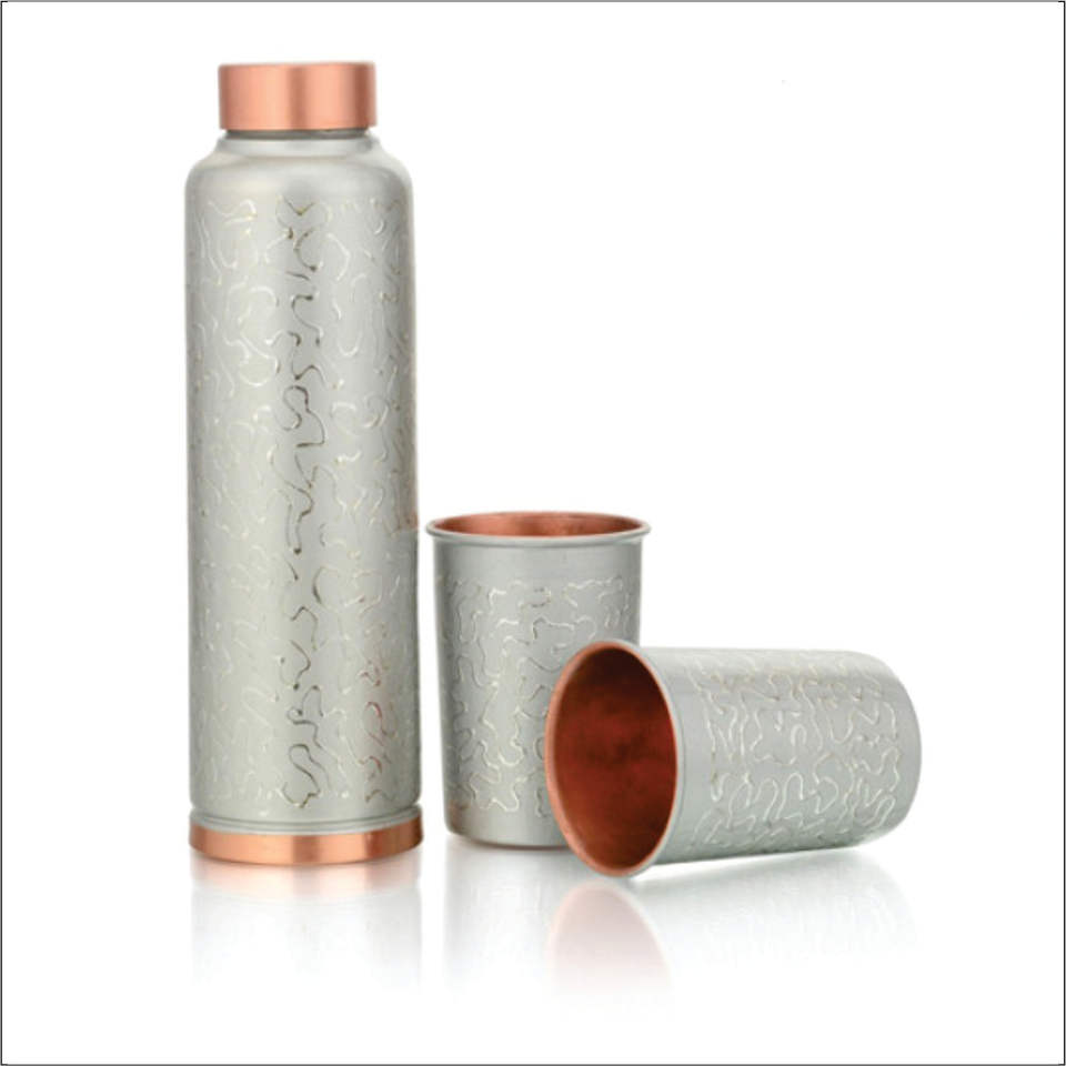 ขวดน้ำทองแดงบริสุทธิ์แบบมีฉนวนกันความร้อนรักษ์โลก สีเงินด้าน ลายพิมพ์ ขวดทองแดงไร้รอยต่อ พร้อมแก้วน้ำ 2 ใบ ขวดน้ำสำหรับเล่นกีฬา